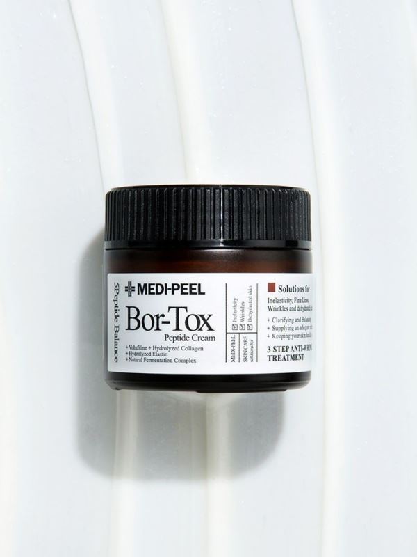 [MEDI-PEEL] Крем для лица с эффектом ботокса Peptide Tox-Bor Cream, 50 мл. Уникальный крем-корректор, предназначенный для интенсивного уменьшения мимических морщин. Крем обогащён гидролизованным коллагеном, эластином и гиалуроновой кислотой. В результате обеспечивается глубокое увлажнение, нормализуется водный баланс клеток кожи, поддерживается её упругость и эластичность. Состав: Aqua, Butylene Glycol, Hydrogenated Polyisobutene, Behenyl Alcohol, Glycerin, Butyrospermum Parkii (Shea) Butter, C14-22 Alcohols, Triethylhexanoin, 1,2-Hexanediol, Stearic Acid, Palmitic Acid, Cetearyl Olivate, Ethylhexyl Palmitate, Caprylic/​Capric Triglyceride, Propanediol, Sorbitan Olivate, C12-20 Alkyl Glucoside, Simethicone, Hydroxyethyl Acrylate/​Sodium Acryloyldimethyl Taurate Copolymer, Tocopherol, Allantoin, Arginine, Trehalose, Panthenol, Sorbitan Isostearate, Leontopodium Alpinum Callus Culture Extract, Saccharomyces/​Rice Ferment Filtrate, Lactobacillus Ferment, Lactobacillus/​Pear Juice Ferment Filtrate, Lactobacillus/​Punica Granatum Fruit Ferment Extract, Lactobacillus/​Soybean Ferment Extract, Saccharomyces/​Barley Seed Ferment Filtrate, Lactococcus Ferment, Chondrus Crispus Extract, Jania Rubens Extract, Anemarrhena Asphodeloides Root Extract (20 Ppm), Malt Extract, Hydrolyzed Collagen, Hydrolyzed Elastin, Sodium Hyaluronate, Copper Tripeptide-1(20 Ppb), Acetyl Hexapeptide-8(10 Ppb), Palmitoyl Pentapeptide-4(10 Ppb), Palmitoyl Tetrapeptide-7(5 Ppb), Palmitoyl Tripeptide-1(5 Ppb), Ethylhexylglycerin, Adenosine, Polysorbate 60, Disodium EDTA, Parfum. Только для наружного применения. Избегайте контакта с глазами. Хранить в недоступных для детей местах. Не использовать на повреждённых участках кожи. В случае появления раздражения, немедленно прекратить использование. Хранить при температуре от +5°С до +25°С. Применение: нанесите небольшое количество крема в качестве завершающего этапа ухода. Изготовитель: SKINIDEA CO.,LTD.TOWER B-1112,167, Songpa-Daero, Songpa-Gu, Seoul, Republic of Korea. Организация, принимающая претензии: ИП Верейкин Е.С., 690089, Приморский край, г. Владивосток, ул. Иртышская, дом № 48, кв.38. Vereykin.e@gmail.com. Номер партии: см. на упаковке. Срок годности: 36 месяцев. Годен до: см. на упаковке (гг/мм/дд). Объем: 50 мл. Артикул: 347455. Товар сертифицирован.