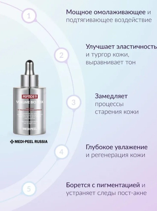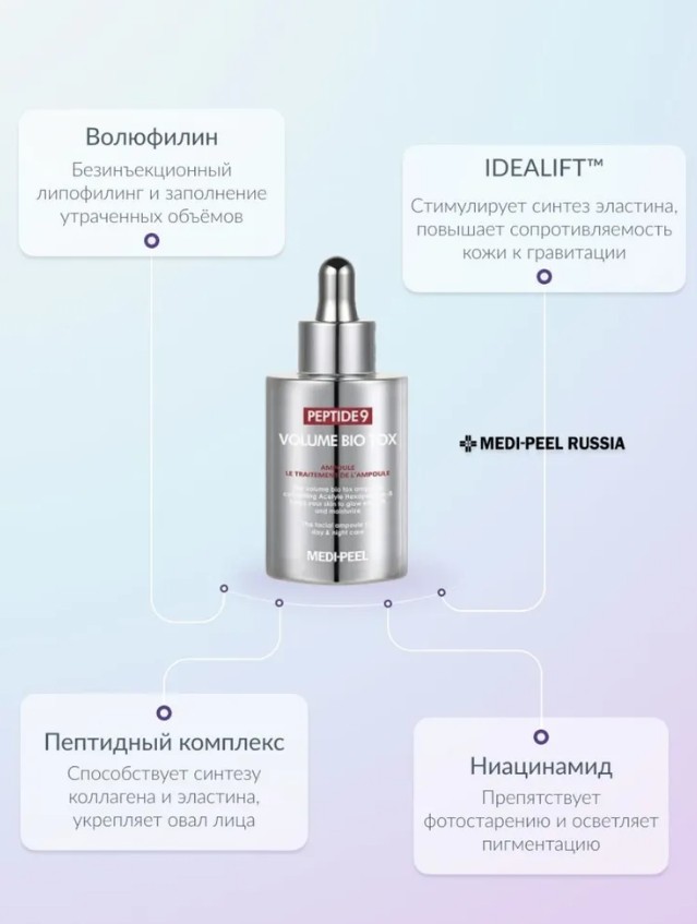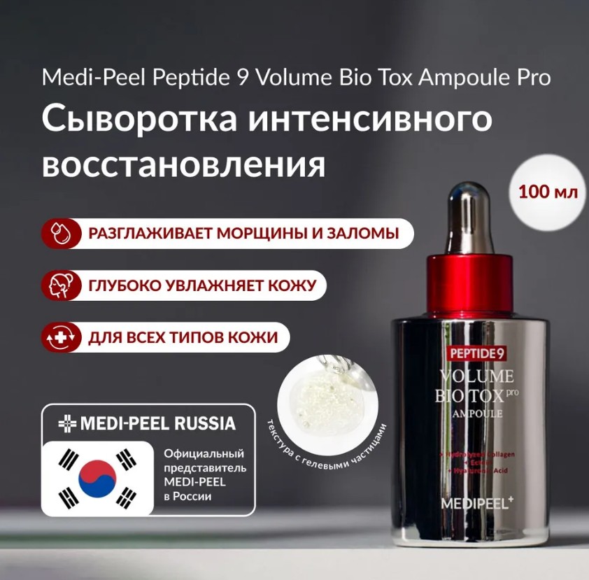 Пептидная ампула для лица Medi-Peel Peptide 9 Volume Bio Tox Ampoule Pro — это усиленная версия омолаживающей ампульной сыворотки, которая содержит более высокую концентрацию активов, за счёт чего работает быстрее и эффективнее.