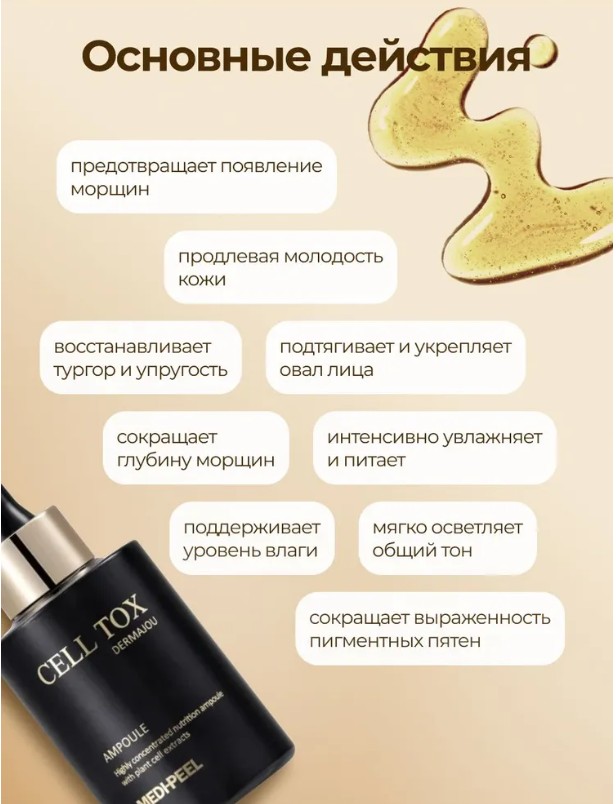 Medi-Peel Ампульная сыворотка со стволовыми клетками Cell Toxing Dermajours Ampoule содержит стволовые клетки растений, которые способствуют обновлению и восстановлению кожи. Она подходит для всех типов кожи и особенно рекомендуется для зрелой и поврежденной.