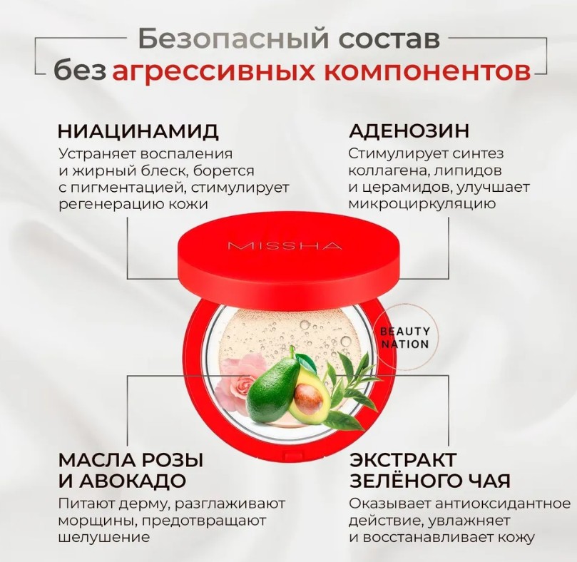 Тональный кушон с матовым финишем Missha Velvet Finish Cushion SPF50+ PA+++ — многофункциональное тональное и уходовое средство, которое прекрасно подойдёт для жирной и комбинированной кожи.
