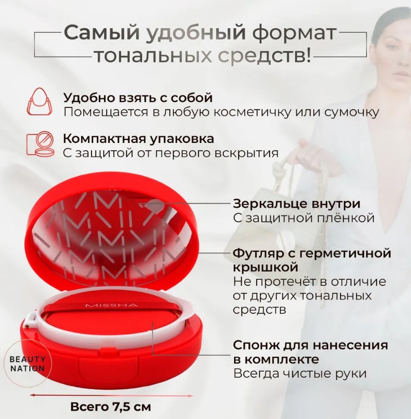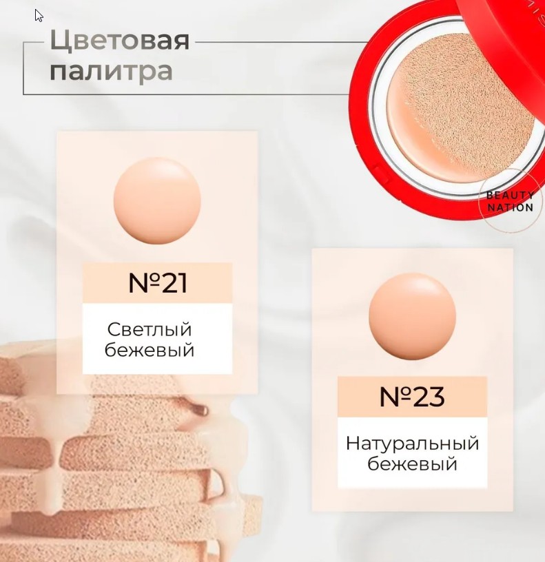 Кушон оставляет бархатный матовый финиш, не пересушивает и не стягивает кожу. Лёгкое естественное покрытие совершенно не ощущается на коже и не оставляет ощущения «маски», прекрасно скрывает несовершенства и выравнивает тон.
