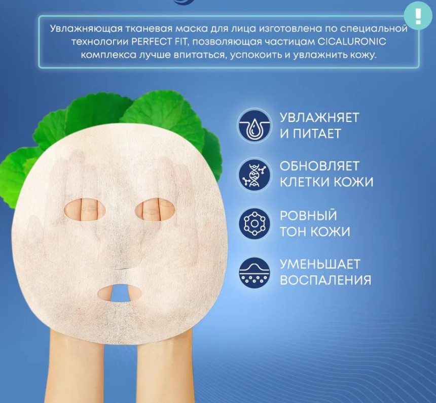 Увлажняющая тканевая маска для лица от MIZON изготовлена по специальной технологии PERFECT FIT, позволяющая частицам CICALURONIC комплекса лучше впитаться, успокоить и увлажнить кожу.