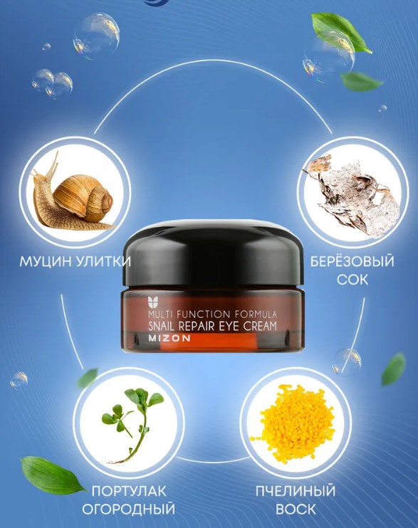 Крем бережно ухаживает за кожей вокруг глаз, содержит мощные омолаживающие, ухаживающие и оздоравливающие кожу компоненты: экстракт слизи улитки (80%), EGF, ниацинамид, аденозин, гиалуроновая кислота, а также натуральные экстракты и масла. Улиточный муцин – оказывает мощное антивозрастное действие, стимулирует выработку коллагена и эластина, устраняет пигментацию, оказывает противовоспалительное и ранозаживляющее действие, ускоряет регенерацию, предупреждает возникновение рубцов. Регулярное применение крема значительно улучшит кожу вокруг глаз – она станет более ровной, упругой, увлажненной. Круги под глазами, как и отеки, станут значительно меньше, гусиные лапки разгладятся.