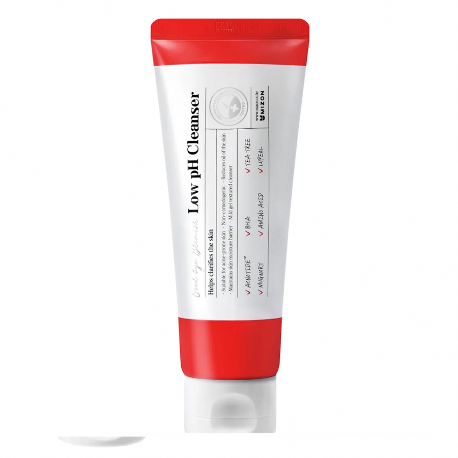 Успокаивающая пенка для умывания GOOD BYE BLEMISH LOW pH CLEANSER с низким pH от MIZON содержит запатентованный антимикробный пептидный комплекс Acnotide TM, а также масло полыни обыкновенной, экстракт чайного дерева и лупеол.