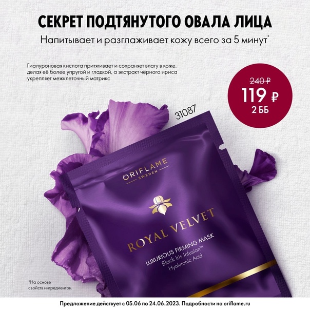 Маска с гиалуроновой кислотой и эликсиром черного ириса укрепляет каркас кожи, тонизирует и увлажняет. Всего 5 минут — и твоя кожа подтянутая, гладкая и эластичная.
