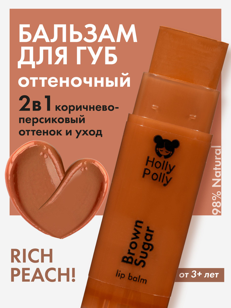 Бальзам оттеночный для губ Holly Polly RICH PEACH! Brown Sugar (Коричнево-персиковый оттенок) разработан для увлажнения, питания, смягчения и заживления чувствительной кожи, придает идеальный коричневый персиковый цвет, подчеркивает естественную красоту губ, создает лёгкий блеск и сияние. Сладкий аромат шоколадного чизкейка поднимет настроение и покажет, как ты неотразима! Он убережет от обветривания, шелушений, трещин и сухости. Эта защитная гигиеническая помадка необходима для ухода за собой в любое время года. Помада-бальзам легко ложится, сохраняя красоту и здоровье. Может использоваться как самостоятельное увлажняющее бьюти косметическое средство. Ухаживающие компоненты: пчелиный воск, масло миндаля, масло ши, жожоба, сквален, облепиховое масло проникают в глубокие слои сухой кожи. Восстанавливающий эффект, как от масла-бальзама обеспечен. Нежная масляная текстура избавит от дискомфорта и неприятных ощущений. Прекрасная альтернатива продуктам из Кореи, заживляющим корейским бальзамам. Парфюмированная губнушка с ароматом может стать удачным дополнением к любому подарку, на любой праздник. Сладкий запах понравится и взрослой женщине и подростку. Она оттеночная, поэтому ее можно использовать как детскую губнушку в категории 3+ и подростковую. Замечательно подойдет ребенку, девочке от 3 лет. Это косметика для всех и должна быть в косметичке любой девушки. Гигиеническая помада Холли Полли — отличный подарочный новогодний вариант для всех родных и близких на Новый год. Дети тоже будут рады такому подарочку под елкой. Интересная, молодежная и свежая идея того, что подарить на НГ или ДР подружке. Универсальная для мамы, сестры или подруги. Женская уходовая и декоративная косметика для лица — приятный презент коллеге на 8 Марта и любимой мамочке на День матери. Маленький красивый товар станет для нее хорошим сюрпризом от дочки. Лучшее решение для подарка на Рождество, на День рождения, да и просто так, без повода.