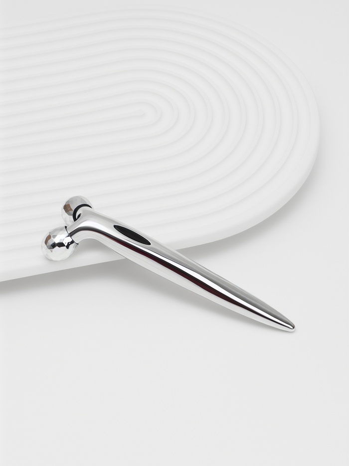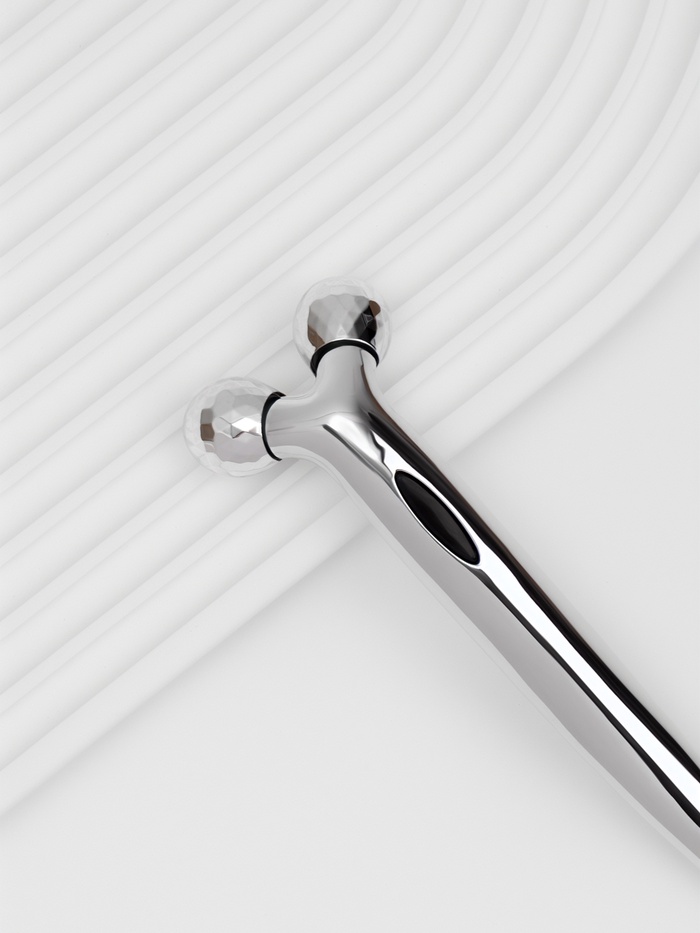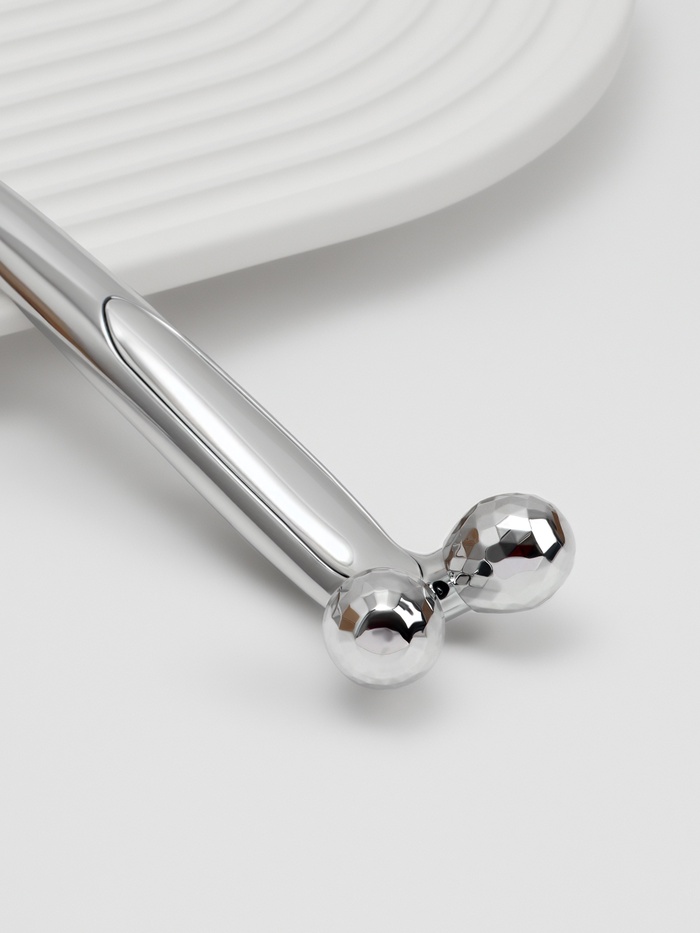Серебристый роликовый массажёр с двумя шарами – стильный инструмент для комплексного ухода за лицом и зоной декольте. Его компактные размеры (14.3×4.5 см) позволяют эффективно прорабатывать даже труднодоступные области, включая носогубные складки и зону вокруг глаз.