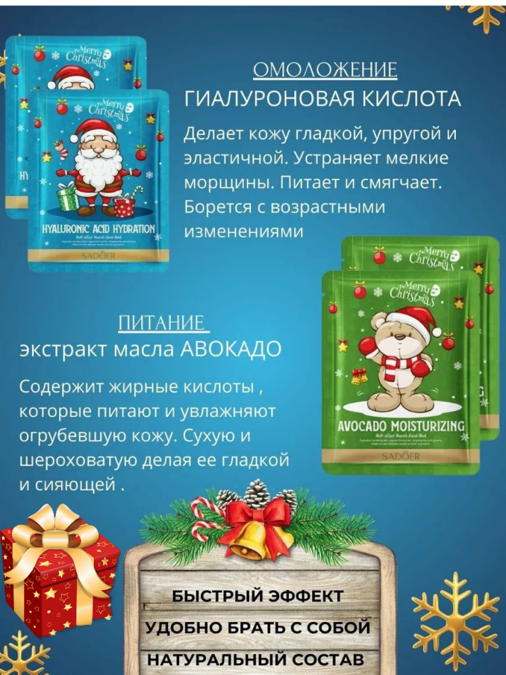 Набор красочных новогодних масок в подарочной упаковки -5 шт. Каждая маска в этом наборе тщательно разработана, чтобы обеспечить вашу кожу необходимым уходом и восстановлением, используя силу натуральных ингредиентов.