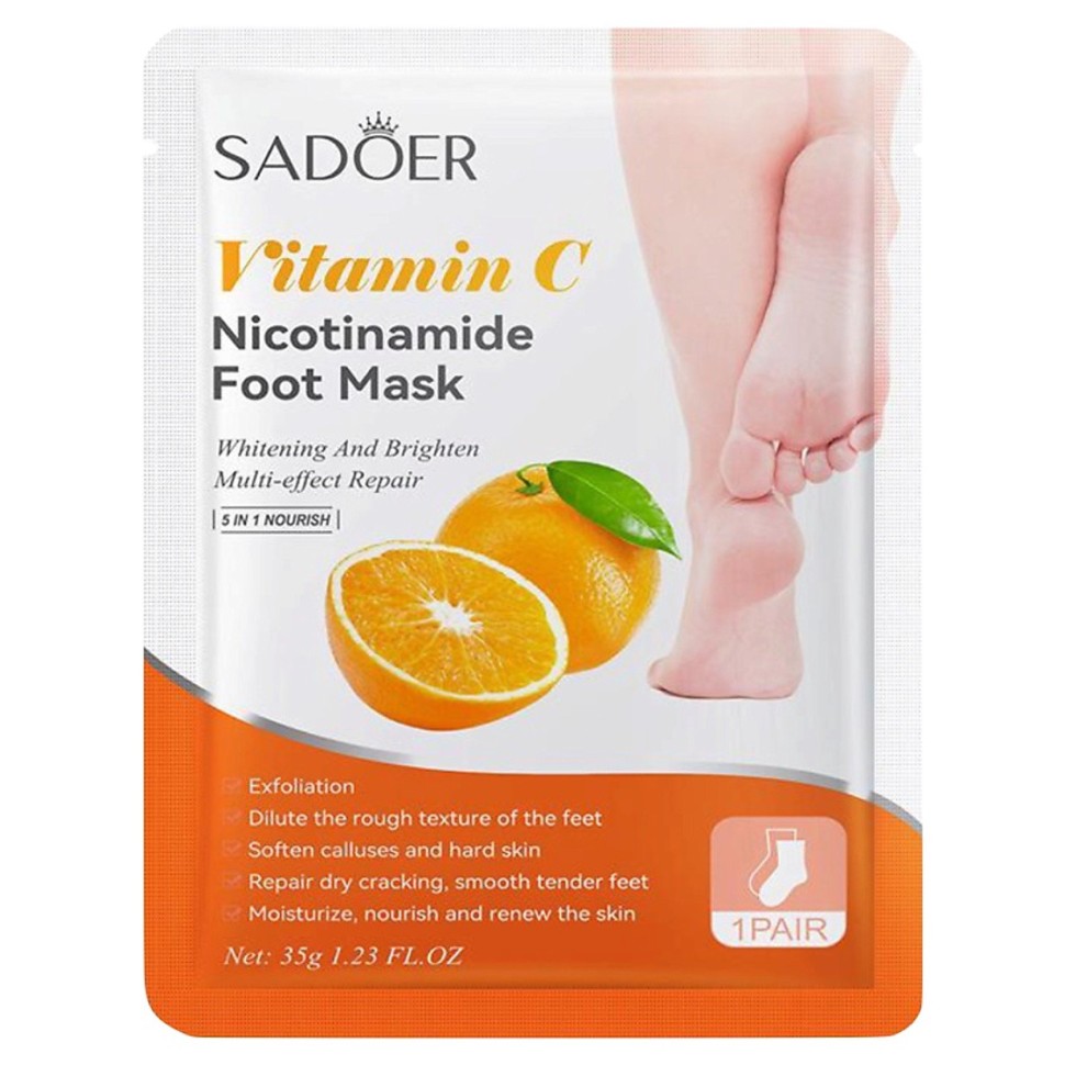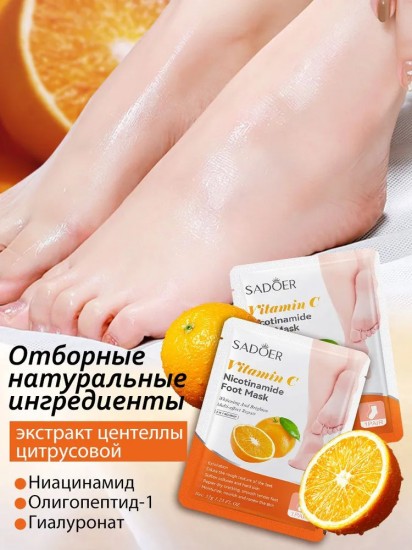 Маска для ног Sadoer с никотинамидом и витамином С 35 гр. Маска для ног носочки на основе натурального витамина С и никотинамида оказывает смягчающее, питательное, увлажняющее, омолаживающее и осветляющее действие. Витамин С в составе средства омолаживает и восстанавливает кожу, запуская ускоренную регенерацию клеток и улучшая обменные процессы. Так же Витамин С бережно осветляет пигментные пятна. Благодаря никотинамиду входящему в состав кожа омолаживается, приходит в тонус, повышается эластичность и защитные функции кожного покрова. Доверьтесь не корейской косметике и наслаждайтесь результатом от ухоженной и увлажненной кожи ног. Шикарный вариант подарка для женщин любого возраста, для мамы, сестры, любимой девушке в день рождения, новый год, 14 февраля, 8 марта или просто так. Рекомендуется использовать 1-2 раза в неделю.