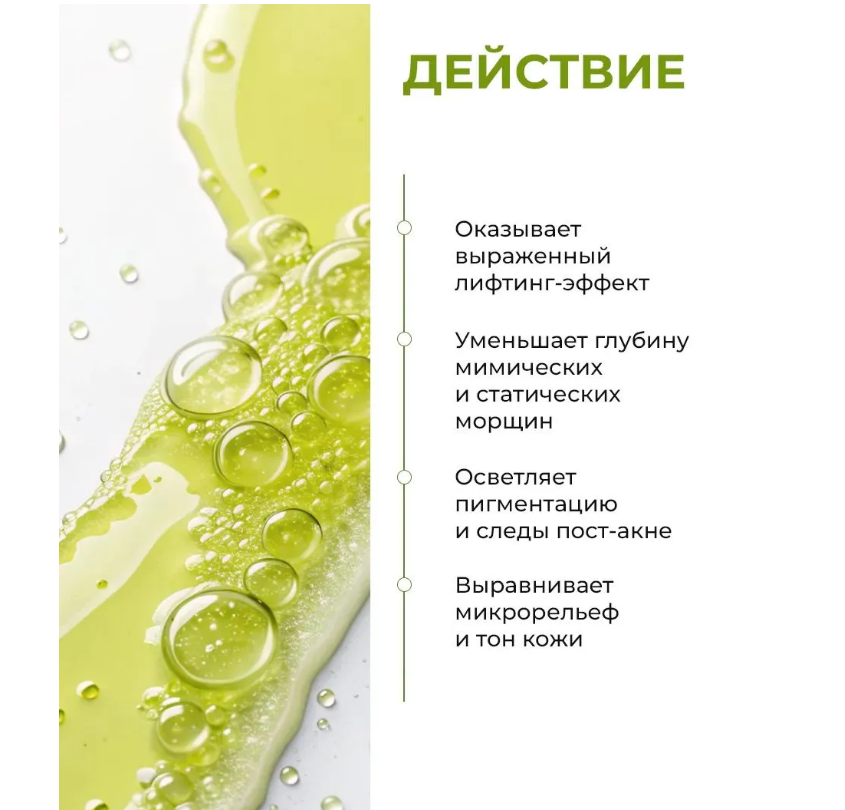 Продукт оказывает выраженный лифтинг-эффект — предотвращает птоз тканей, повышает упругость и эластичность, уменьшает глубину мимических и статических морщин, предупреждает их появление.