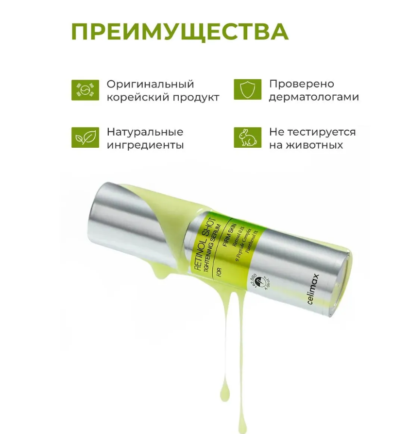 Антивозрастная сыворотка с ретинолом и микроиглами CelimaxThe Vita−A Retinol Shot Tightening Serum обеспечивает интенсивный уход для кожи с признаками старения и симптомами акне. Осветляет как возрастную, так и поствоспалительную пигментацию, устраняет следы постакне и застойные пятна, выравнивает текстуру и тон, придаёт естественное сияние.