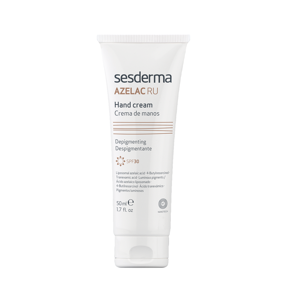 SESDERMA ( Сесдерма ) Крем для рук депигментирующий AZELAC RU корректирует проявления пигментации на руках и предотвращает риск появления новых проявлений пигментации, вызванной солнечным излучением и возрастными факторами. Улучшает и выравнивает тон кожи. Крем обладает лёгкой текстурой и быстро впитывается. Средство разработано с использованием технологии NANOTECH. Ее уникальность заключается в использовании активных ингредиентов, помещенных в липосомы наноразмера, – маленькие липидные контейнеры, позволяющие компонентам в кратчайшие сроки проникать в глубокие слои кожи и тем самым повышать эффективность средства.