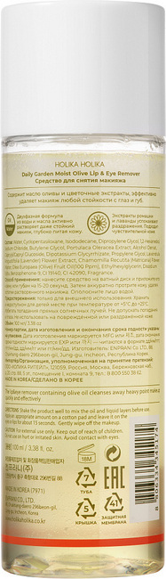 Средство для снятия макияжа. Содержит масло оливы и цветочные экстракты, эффективно удаляет макияж любой стойкости с глаз и губ. Двухфазная формула из воды и масла активно растворяет даже стойкий макияж, глубоко питая кожу. Экстракты ромашки и лаванды успокаивают раздражения. Подходит чувствительной коже.