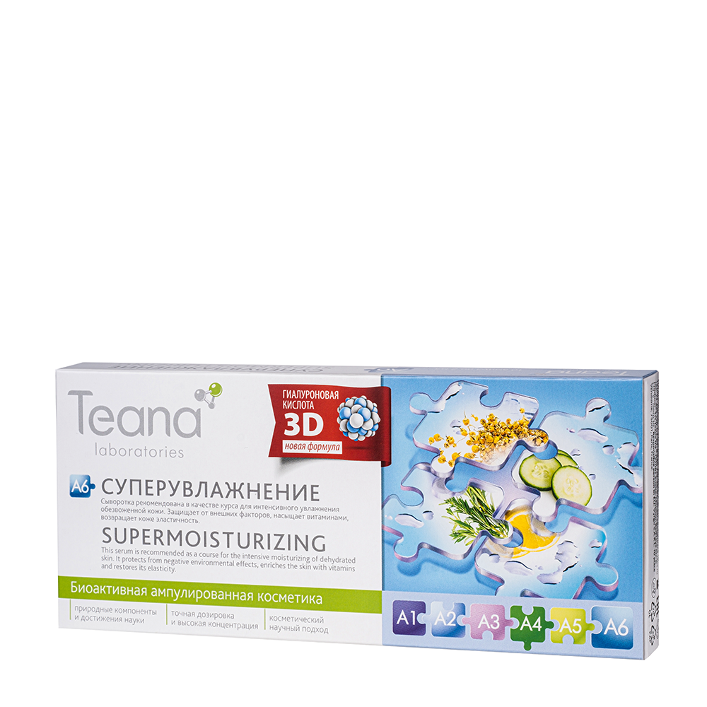 TEANA ( Тиана ) Высокоэффективное средство для интенсивного увлажнения обезвоженной и реактивной кожи. Оказывает тонизирующее и общеоздоравливающее действие: насыщает клетки кожи витаминами и полезными микроэлементами, помогает восстановить целостность эпидермиса, устранить покраснения и ощущение стянутости. Специально разработанная 3D-система доставки гиалуроновой кислоты разных фракций в глубинные слои кожи обеспечивает мгновенное проникновение питательных веществ, благодаря чему кожа приобретает мягкость и упругость. Регулярное применение сыворотки повышает эластичность и обеспечивает длительное увлажнение в течение всего дня. Кожа получает максимальный комфорт, исчезает шелушение и раздражение. Подходит для сухой, атоничной, обезвоженной и чувствительной кожи.