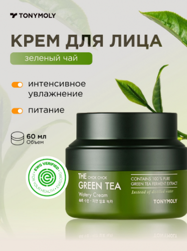Крем для лица Tony Moly Chok Chok Green Tea Watery Cream создан на базе натурального экстракта зелёного чая и эфирных масел лимонника и розового дерева. Крем даёт коже необходимый уход в течение всего дня: