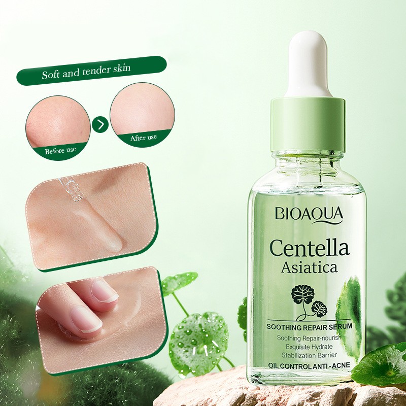 Успокаивающая сыворотка с э..показатькстрактом центеллы азиатской BIOAQUA успокаивает раздраженную кожу, снимает неприятные ощущения и зуд, уменьшает очаги воспаления. Глубоко оздоравливает, препятствует появлению акне и высыпаний, улучшает тон лица. Сыворотка регулирует работу сальных желез, устраняет жирный блеск и препятствует забиванию пор. Разглаживает микрорельеф, улучшает текстуру кожи, уменьшает видимость пор. Укрепляет защитный барьер, делает кожу менее реактивной, нормализует водно-липидный баланс.