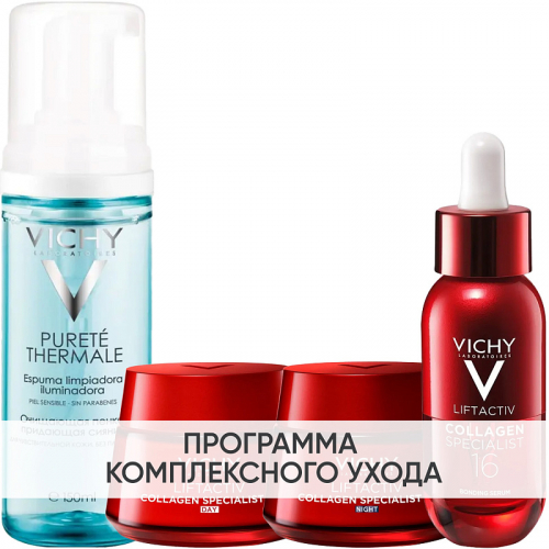 ПРОГРАММА КОМПЛЕКСНОГО УХОДА Vichy Liftactiv Collagen Specialist для борьбы с признаками старения лица. Комплексный уход представляет собой дополняющие друг друга средства, совместное использование которых будет максимально эффективным. Первым шагом программы является очищение, вторым - основной уход. В третий шаг вошли дополнительные средства, усиливающие эффект основной программы и применяемые постоянно или периодически на различных этапах ухода.