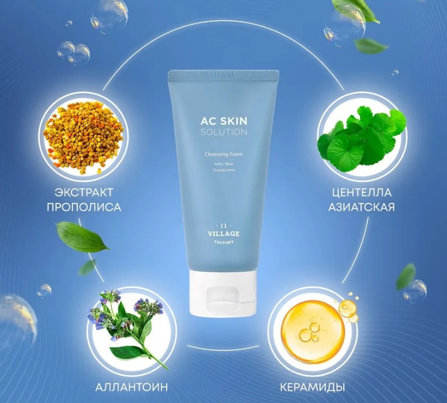 Нежная пенка Village 11 Factory AC Skin Solution Cleansing Foam очищает жирную, комбинированную и проблемную кожу, удаляет макияж, избавляет от грязи, пыли, избытков себума, оставляя придавая мягкость и гладкость.