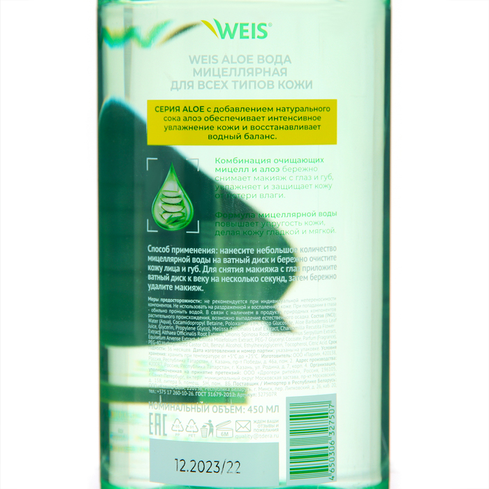 Мицеллярная вода для лица WEIS Aloe для всех типов кожи, 450 мл