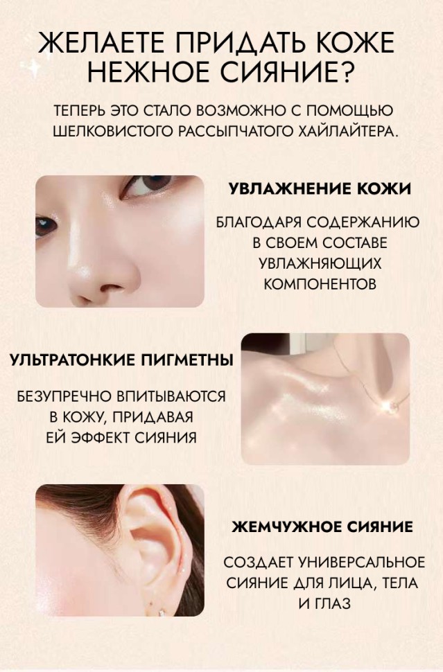 Хайлайтер для лица с запеченной текстурой состоит из двух шиммерных оттенков с мелкими блестками. Невесомая текстура сухого хайлайтера идеально ложится на любую кожу подчеркивая её естественную красоту и придавая ей загадочное сияние. Хайлайтер неотъемлемая часть контуринга лица, он легко наносится и растушевывется кистью для макияжа, создавая эффект "мягкого фокуса". Сухой хайлайтер имеет компактную упаковку, которую удобно брать с собой. Для лучшего эффекта рекомендуется наносить хайлайтер кистью для макияжа на выступающие части лица: область над бровями, скулы, пространство над верхней губой, кончик носа. Небольшой лайфхак - если нанести хайлайтер в уголки глаз, ваш взгляд станет более выразителным.