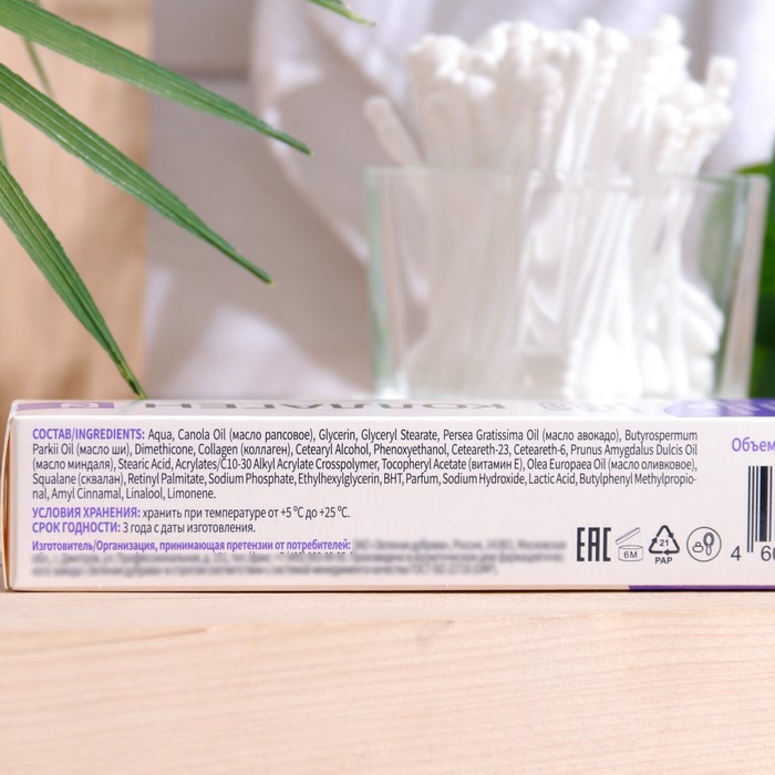 Состав: aqua, glycine soja oil (масло соевое), cocos nucifera oil (масло кокосовое), glycerin (глицерин), glyceryl stearate, paraffinum liquidum, cetearyl alcohol, olea europaea oil (масло оливковое), dimethicone, collagen (коллаген), ceteareth-23, ceteareth-6, phenoxyethanol, stearic acid, acrylates/C10-30 alkyl acrylate crosspolymer, squalane (сквалан), tocopheryl acetate (витамин Е), retinyl palmitate (витамин А), sodium phosphate, ethylhexylglycerin, BHT, parfum, sodium hydroxide, lactic acid, butylphenyl methylpropional, amyl cinnamal, linalool, limonene.