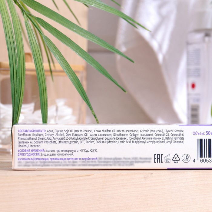Состав: aqua, glycine soja oil (масло соевое), cocos nucifera oil (масло кокосовое), glycerin (глицерин), glyceryl stearate, paraffinum liquidum, cetearyl alcohol, olea europaea oil (масло оливковое), dimethicone, collagen (коллаген), ceteareth-23, ceteareth-6, phenoxyethanol, stearic acid, acrylates/C10-30 alkyl acrylate crosspolymer, squalane (сквалан), tocopheryl acetate (витамин Е), retinyl palmitate (витамин А), sodium phosphate, ethylhexylglycerin, BHT, parfum, sodium hydroxide, lactic acid, butylphenyl methylpropional, amyl cinnamal, linalool, limonene.