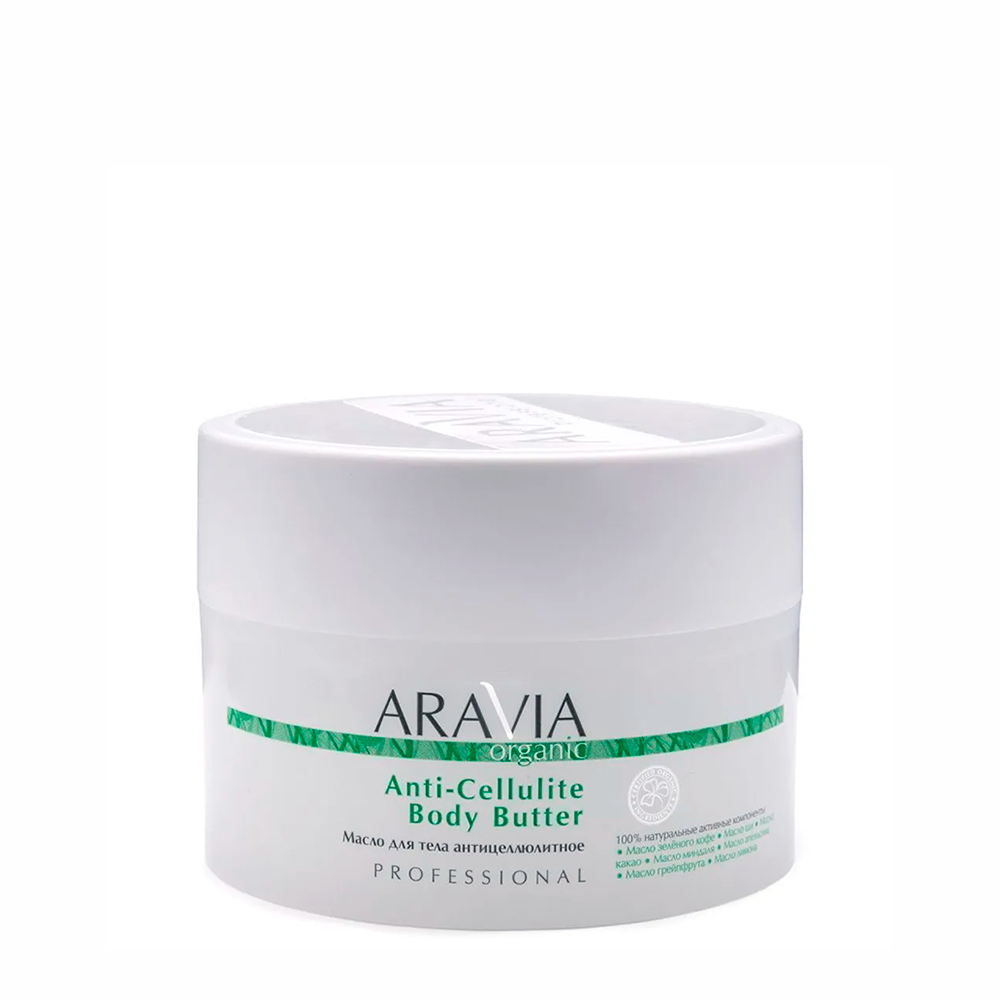 ARAVIA ( АРАВИЯ ) 100% натуральное масло (баттер) для тела, без консервантов. Сочетание натуральных растительных масел предотвращает появление целлюлита, уменьшает его внешние проявления, а также быстро улучшает состояние кожного покрова, усиливает эластичность и плотность кожи. Входящее в состав масло зелёного кофе улучшает синтез коллагена, стимулирует биохимические процессы расщепления жира и уменьшения целлюлита. Повышает сопротивляемость кожи воздействию окружающей среды.