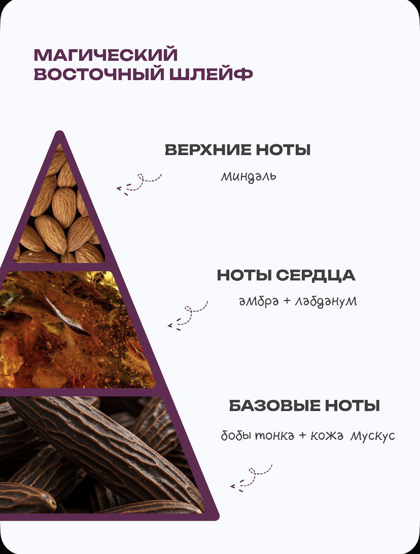 Аромат звучит глубоко и маняще: нежный миндальный шлейф соединяется с тёплой древесной нотой, переходя в богатое сердце из амбры и лабданума. В финале остаются аккорды кожи, песчаной дюны и мускусный шлейф, создающий атмосферу восточной магии — томной, яркой и завораживающей.