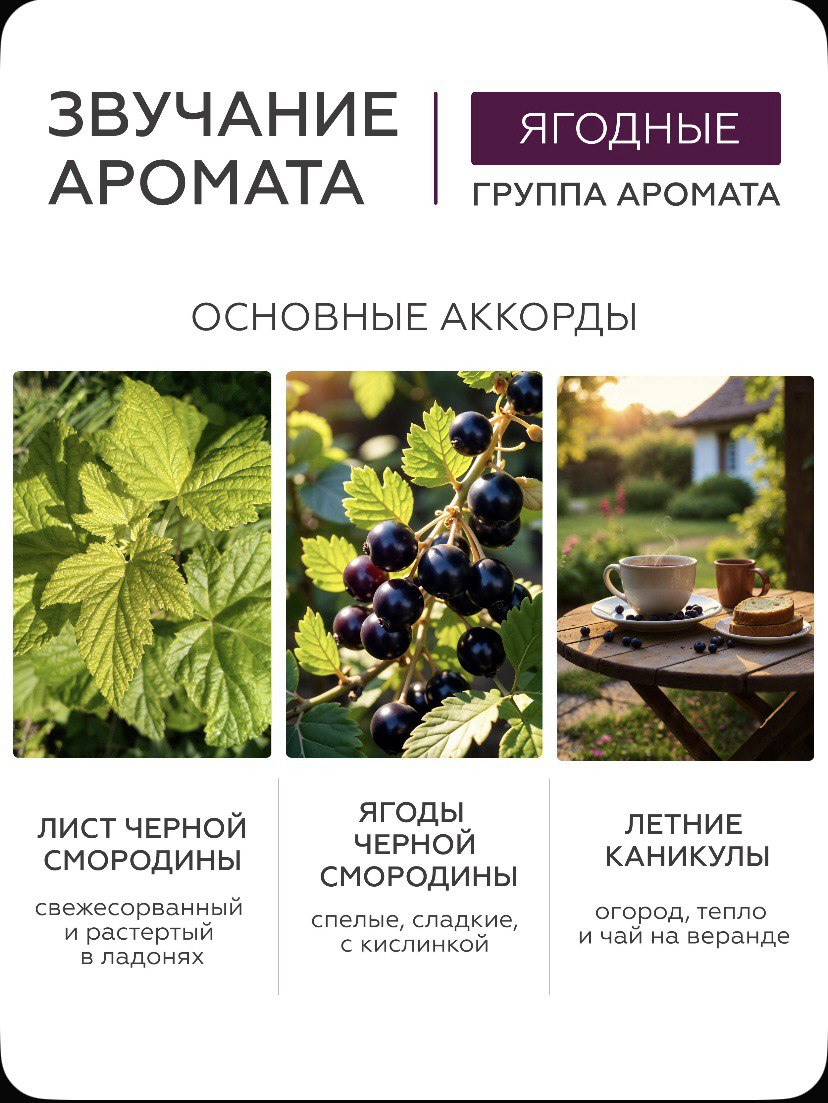 При контакте с водой средство превращается в нежную эмульсию, которая очищает, смягчает кожу и легко смывается водой. Невероятно яркий, реалистичный, с детства знакомый аромат только что сорванных с куста ягод чёрной смородины возвращает вас в беззаботное лето на даче и дарит ощущение безусловного счастья.