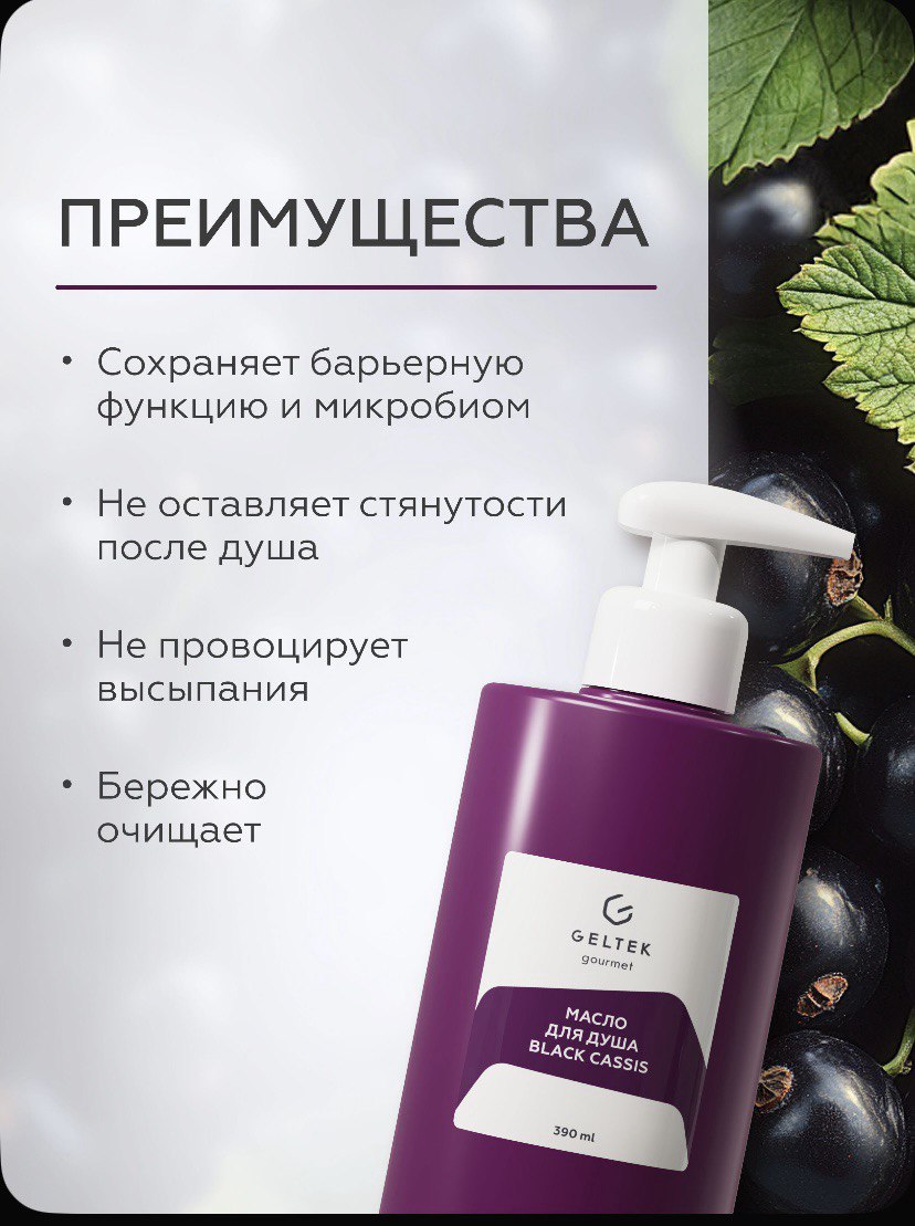 Масло с ароматом чёрной смородины предназначено для бережного очищения чувствительной, раздражённой, сухой, огрубевшей кожи любого типа. Некомедогенная формула с мягкой моющей основой не раздражает и не стягивает кожу. Пребиотики и антиоксиданты в составе помогают сохранить здоровый микробиом и поддерживать защитный барьер кожи.