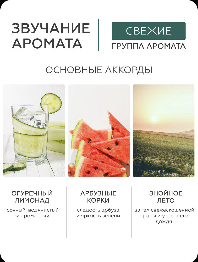 При контакте с водой средство превращается в нежную эмульсию, которая очищает, смягчает кожу и легко смывается водой. Лёгкий ненавязчивый аромат огуречного лимонада усиливает ощущение чистоты и свежести.
