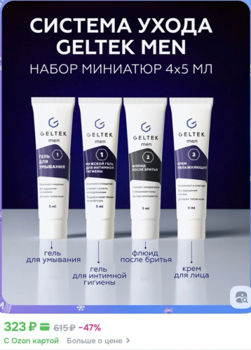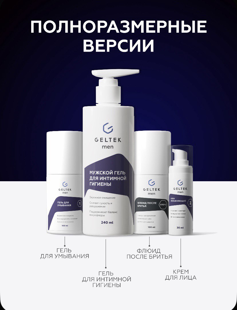 Мини-комплект позволяет познакомиться с базовыми средствами линейки Geltek Men. Это идеальный формат для путешествий и прекрасная идея для подарка близким.