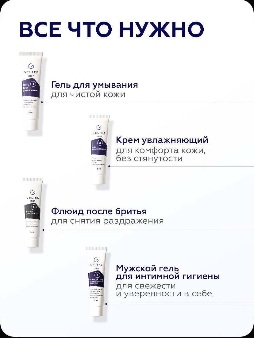 1. Крем увлажняющий Geltek Men (5 мл). Это универсальный продукт, который отлично увлажняет, питает и ускоряет заживление микроповреждений. Едва уловимый аромат и лёгкая текстура делают уход за кожей комфортным.