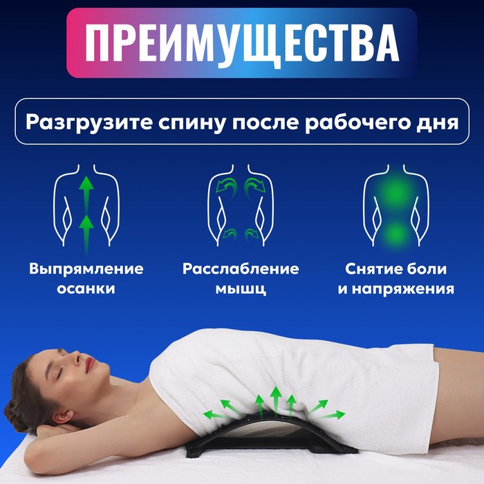 Массажный мостик служит для расслабления, снятия напряжения и боли в спине и пояснице. Он мягко растягивает спину, устраняет межпозвоночные зажимы, повышает гибкость, улучшает осанку и, как следствие, походку. Шипы по краям массажёра воздействуют на спинные мышцы по типу акупунктурного коврика. Мягкая вставка посередине защищает позвоночник от травм.