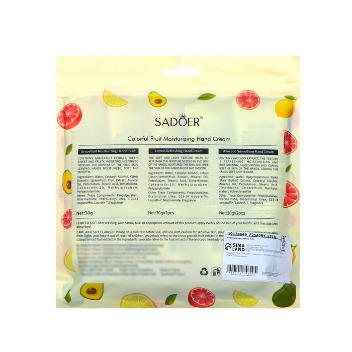 В набор входят увлажняющие крема: крем для рук с лимоном 30 мл - 2 шт, крем для рук с грейпфрутом 30 мл, крем для рук с авокадо 30 мл - 2 шт.