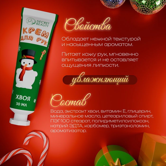 Новогодний крем для рук увлажняющий, 30 мл — это идеальный продукт для зимнего ухода и подарка на Новый год. Легкая текстура крема быстро впитывается, не оставляя жирных следов, при этом обеспечивая интенсивное увлажнение и питание кожи.