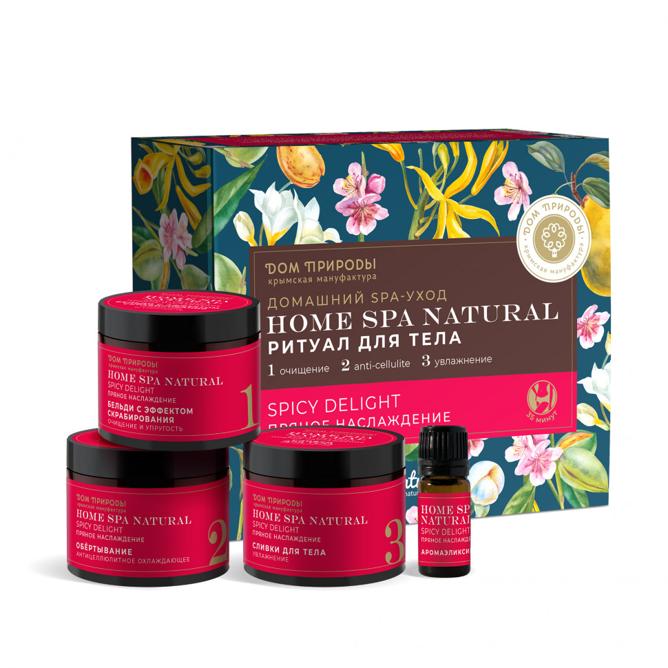 1 шаг Очищение Бьюти-терапия начинается с очищения кожи с помощью бельди с эффектом скрабирования «Очищение и упругость». Микрочастицы перлита деликатно скрабируют кожу, удаляя отмершие клетки. Масло жожоба обладает омолаживающим действием. Нанесите бельди на разогретую влажную кожу. Используйте для очищения мочалку из набора. Остатки средства смойте теплой водой. 2 шаг Обертывание Теперь кожа готова к воздействию антицеллюлитного обертывания с питательными маслами и бело-голубой глиной. Ментол создает легкий охлаждающий эффект. Обертывание стимулирует кровообращение, выравнивает рельеф кожи. Нанесите средство на сухую кожу, оберните пленкой для более интенсивного воздействия. Через 20-25 минут смойте водой и вытрите кожу полотенцем. 3 шаг Увлажнение Нежные кремовые сливки «Увлажнение» с маслами ши, миндаля и экстрактом фиалки - идеальное завершение домашнего SPA-ухода для тела. Дарят коже увлажнение, мягкость и тонкий цветочный аромат. Нанесите сливки на сухую кожу и дайте им впитаться. Придайте ритуалу аромат: добавьте аромаэликсир в воду, аромалампу или просто капните на запястье. Легкий и нежный цветочный аромат с выделяющимися аккордами вишни, фрезии и лотоса погрузит вас в атмосферу неги и релакса.