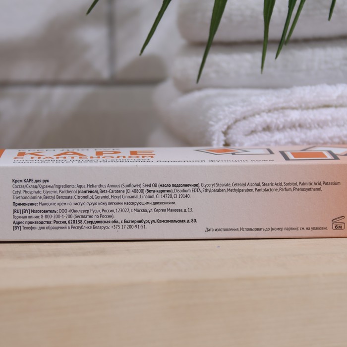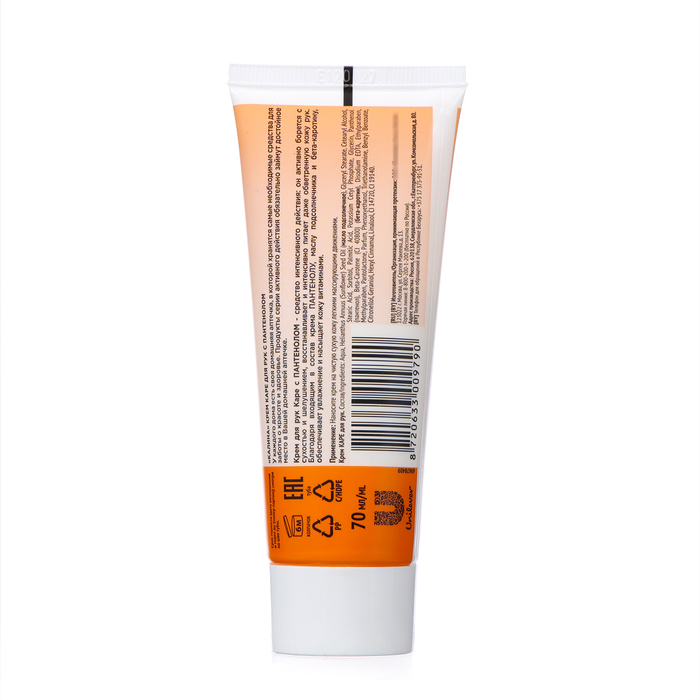 Состав: Ingredients: Aqua, Helianthus Annuus (Sunflower) Seed Oil (масло подсолнечное)**, Glyceryl Stearate, Cetearyl Alcohol, Glycerin (глицерин)**, Stearic Acid, Sorbitol, Palmitic Acid, Potassium Cetyl Phosphate, Beta-Carotene (CI 40800), Chamomilla Recutita (Matricaria) Flower/Leaf Extract (экстракт ромашки)**, Daucus Carota Sativa (Carrot) Root Extract (экстракт моркови)**, DMDM Hydantoin, Glycine Soja (Soybean) Oil (масло соевое)**, Hippophae Rhamnoides Fruit Juice (cок плодов облепихи)**, Hippophae Rhamnoides Oil (масло облепихи), Methylparaben, Parfum, Triethanolamine, Benzyl Benzoate, Butylphenyl Methylpropional, Citronellol, Coumarin, Geraniol, Hexyl Cinnamal, Limonene, Linalool, CI 14720, CI 19140.