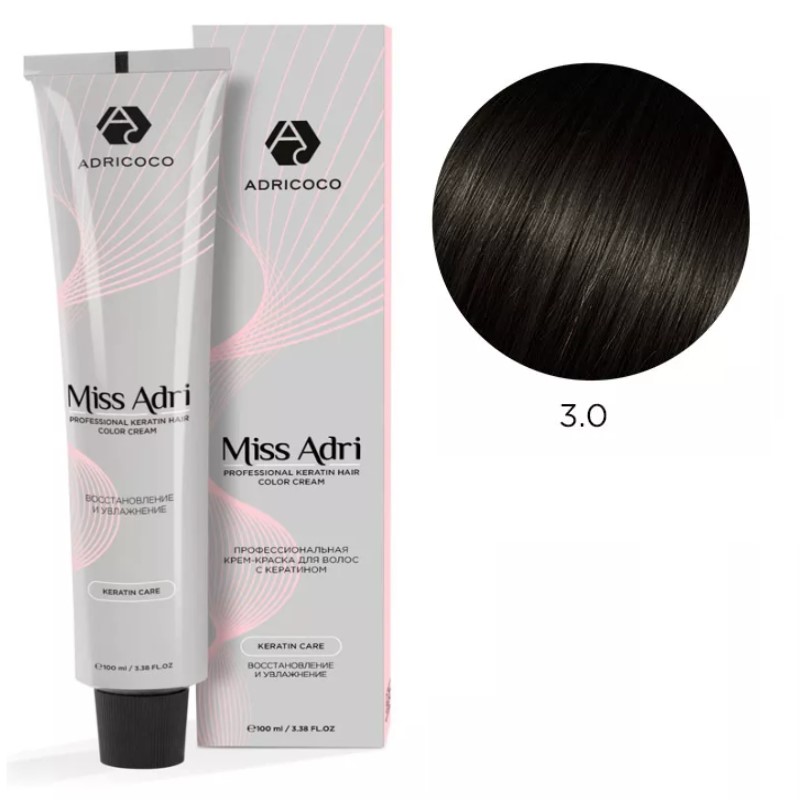 Показания к применению: Крем-краска для волос Miss Adri подарит локонам насыщенный цвет и яркий блеск в течение долгого времени. Мягкая кремообразная консистенция. Стойкость окрашивания до 6 недель. 100% закрашивание седины. Имеет приятную отдушку. Экономичный расход 1:1,5. При стекловидной седине 1:1.