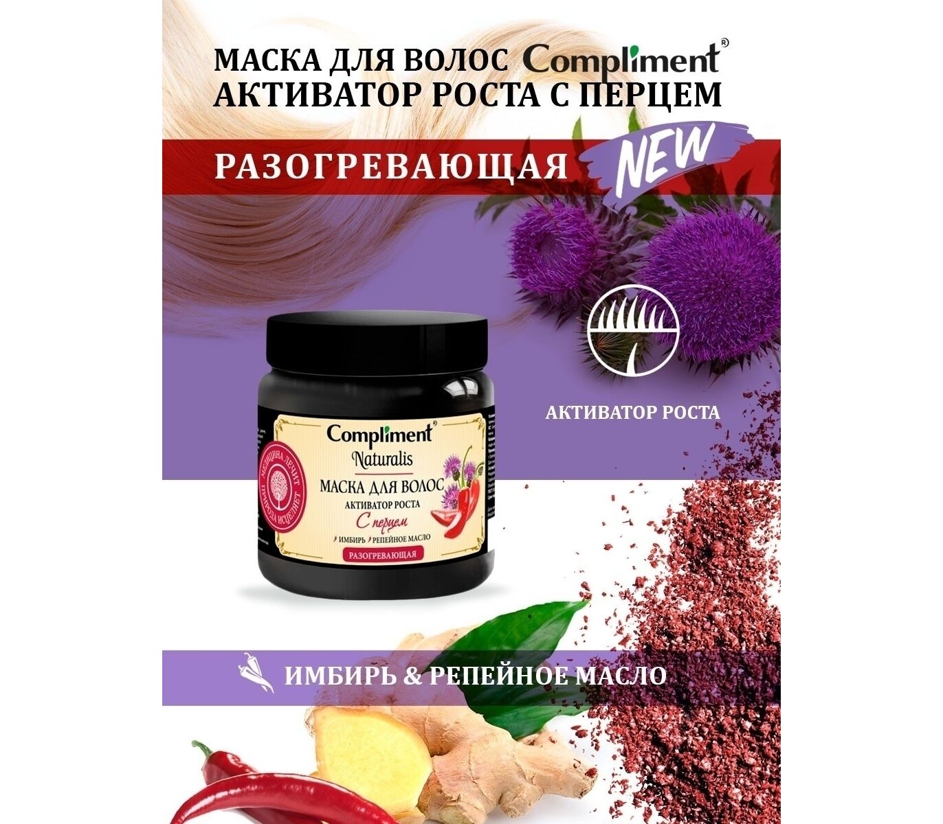 COMPLIMENT Naturalis Маска для волос разогревающая с перцем Активатор Роста Имбирь и Репейное масло 500мл