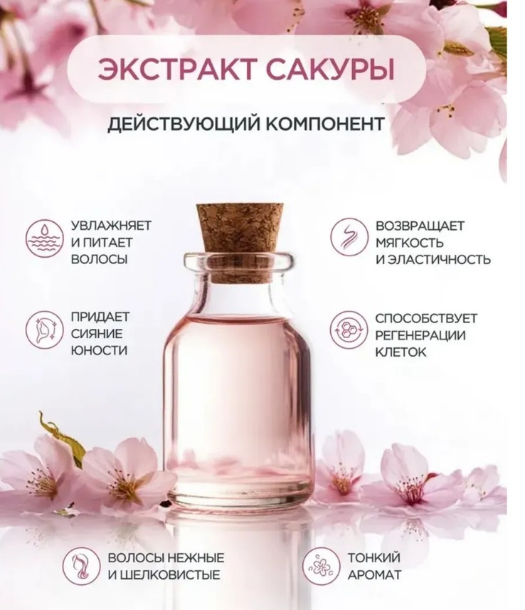Шампунь для гладкости и блеска волос освежает, бережно очищает от загрязнений, пыли, подкожного сала, делая их шикарными, шелковыми и блестящими. Он устраняет зуд и перхоть, предотвращает ее появление. Обеспечивает длительный парфюмерный эффект чарующего аромата сакуры. Увлажняет и витаминизирует кожу, успокаивает ее, останавливает воспаление. Шампунь убирает пушистость, устраняет тусклость и ломкость, возвращает локонам эластичность и улучшает процесс расчесывания, препятствуя выдергиванию волосков расческой. Облегчает укладку, возвращает здоровый блеск. Для любых волос, склонных к сухости и чувствительной кожи головы. Способ применения: помассировать голову с небольшим количеством шампуня, промыть водой.