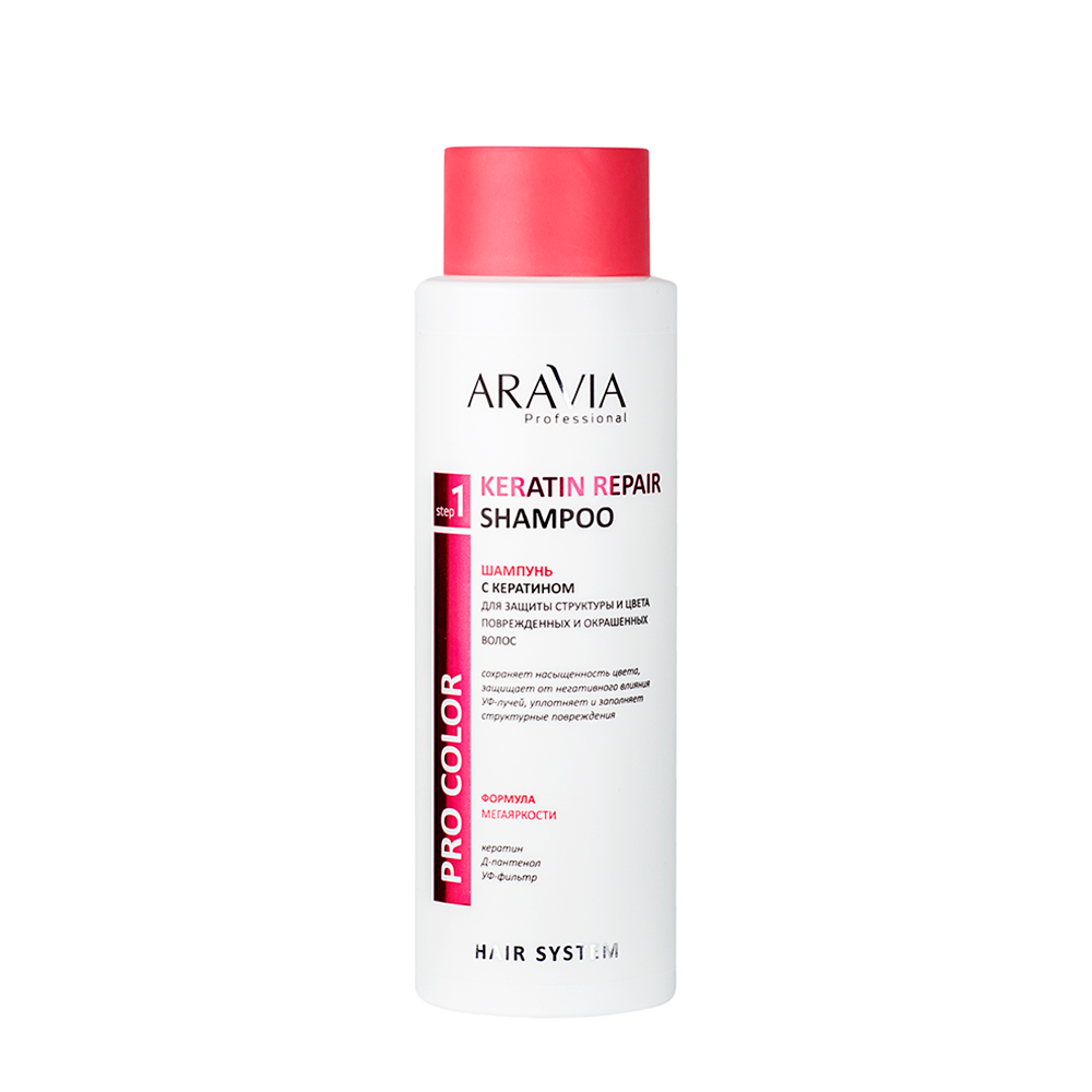 ARAVIA ( АРАВИЯ ) Насыщенная кератиновая формула шампуня для деликатного очищения, активного восстановления поврежденных волос и защиты цвета после окрашивания. Шампунь укрепляет волокно волоса, помогает продлить эффект от процедуры окрашивания, надолго сохраняя максимальную интенсивность цвета и предотвращая его вымывание. Д-пантенол сглаживает кутикулу и наполняет влагой безжизненные пряди, облегчает процесс укладки и делает волосы послушными. УФ-фильтр в составе шампуня препятствует разрушению УФ-лучами липидного слоя, важного для здоровья волосяного стержня, обеспечивая таким образом защиту ослабленным поврежденным волосам, возвращая им мягкость, шелковистость и блеск. Предотвращает потускнение цвета окрашенных волос, а также защищает от «выгорания» натуральные пряди.