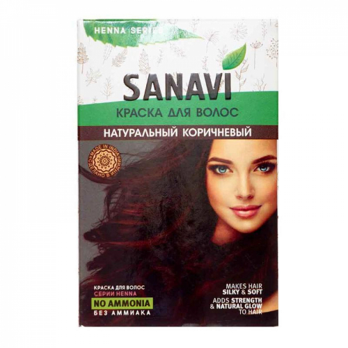 Краски для волос SANAVI изготовлены из натуральной индийской хны и растительных природных компонентов. При окрашивании структура локонов не повреждается. Краска не пересушивает волосы, отлично скрывает седину, цвет получается насыщенным и стойким. Благодаря натуральным компонентам в составе она одновременно обеспечивает профилактику здоровья волос и луковиц. Выравнивает структуру, ускоряет их рост и предотвращает выпадение. Очищает локоны, создает защитный слой от неблагоприятных внешних факторов. Натуральный коричневый оттенок хорошо скрывает небольшую седину. Держать краску нужно полчаса, но для более глубокого цвета можно увеличить время на 5-10 мин. После процедуры волосы приобретают красивый блеск.