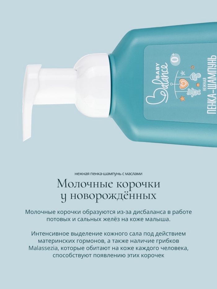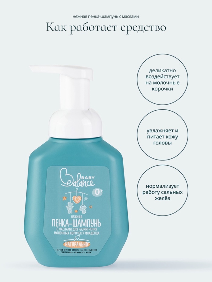 Воздушная текстура нежной пенки-шампунь с маслами для размягчения молочных корочек у младенца эффективно очищает и оказывает кондиционирующий эффект на волосиках малыша. Безопасный гипоаллергенный состав содержит пребиотики для поддержания баланса полезных микроорганизмов и здорового микробиома кожи. Актив олигосахаридов смягчает кожу и помогает справляться с себорейными корочками.