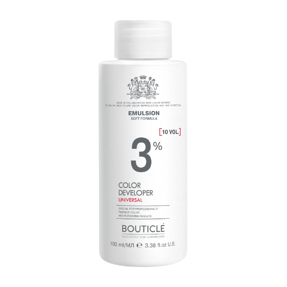 BOUTICLE ( Бутикле ) Оксидант-лосьон 3% (10 vol.). Деликатная формула окисляющей эмульсии обладает увлажняющим и смягчающим действием, обеспечивает эффективную  защиту волос и кожи головы в процессе тонирования, окрашивания и обесцвечивания.