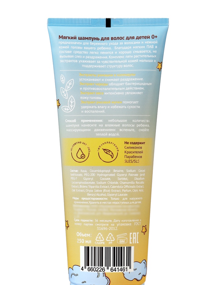 Мягкий шампунь для волос детский 0+ предназначен для бережного ухода за волосами и нежной кожи головы вашего ребенка.