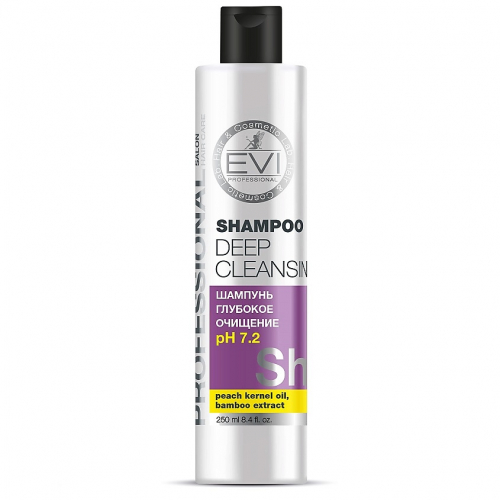 Очищающий шампунь для волос EVI Professional. Шампунь-пилинг создан для глубокого SOFT - очищения чувствительной кожи головы и волос от накопившихся ежедневных загрязнений и укладочных средств; нормализирует выработку сальных желез, увлажняет волосы и кожу головы.