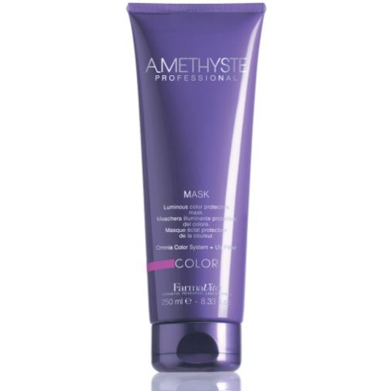 Маска Amethyste Color для ухода за окрашенными волосами позволяет защитить их и сохранить насыщенность цвета. Волосы становятся блестящими, мягкими и легко расчесываются. Инновационная система Omnia Color заметно уменьшает вымывание косметического цвета, обеспечивает значительное увеличение прочности и увлажнения волос. Особая формула придает волосам силу и энергию, благодаря присутствию в составе олигоэлементов (кремний, магний, медь, железо, цинк), которые глубоко проникают в волокна волос, способствуя восстановлению поврежденных участков. Волосы выглядят блестящими, сильными и здоровыми. Активные ингредиенты: система Omnia Color: Масло из семян пенника лугового - драгоценное масло, богато природными антиоксидантами и уникальным составом жирных кислот. Помогает сохранить интенсивность цвета и блеск волос. Исследования показали, что масло проникает в волокна волос, восстанавливая структуру и повышая его прочность. Пантенол - глубоко проникает в структуру и позволяет сбалансировать естественный уровень влаги в волосах. УФ-фильтр - защищает волосы от выгорания на солнце, вымывания красителя и потускнения цвета. Олигоминеральный комплекс - комплекс олигоэлементов (кремний, магний, медь, железо, цинк), которые глубоко проникают в волокна волос и помогают восстановить поврежденные участки. Способ применения: после применения шампуня нанести маску Amethyste Color на чистые, влажные, подсушенные полотенцем волосы, равномерно распределить по длине. Для лучшего распределения по волосам можно расчесать волосы широким гребнем. Выдержать 2-3 минуты. Смыть. Приступить к укладке. Для достижения максимального эффекта рекомендуется применять вместе с шампунем Amethyste Color и лосьоном Amethyste Color Re-Vital.