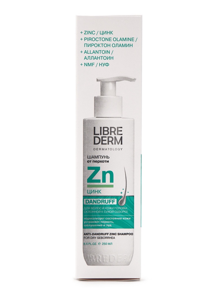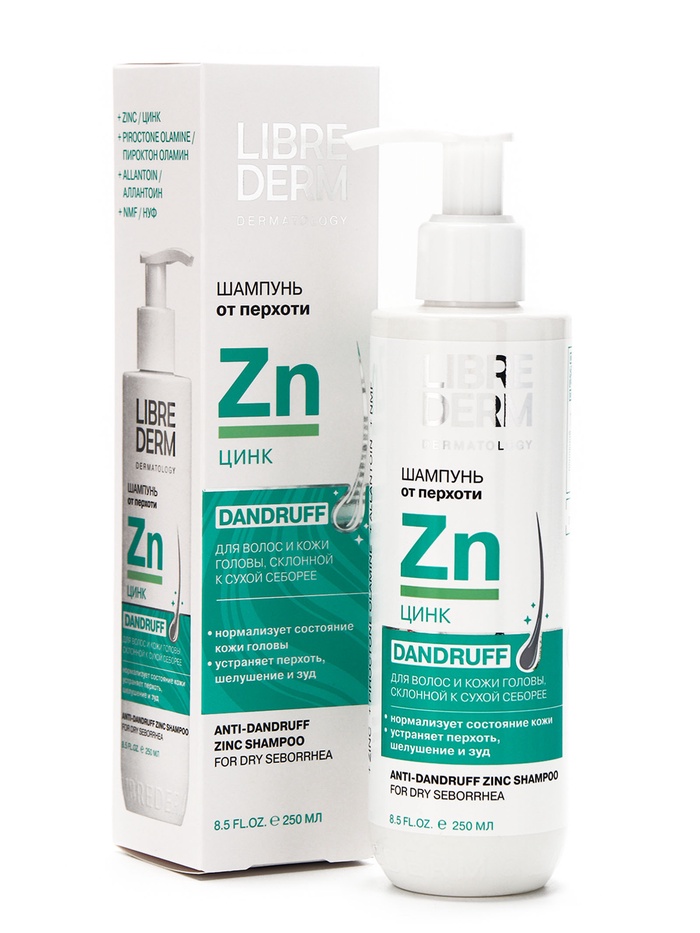Шампунь ЦИНК предназначен от перхоти при сухой коже головы. Эффективно очищает кожу головы и волосы, отшелушивает ороговевшие чешуйки, уменьшает гиперкератоз, нормализует выработку кожного сала, способствует быстрому устранению симптомов сухой себореи, устраняет зуд и жжение, успокаивает кожу головы. Пиритион цинка оказывает противомикробное, бактериостатическое и фунгицидное действие. Д-Пантенол и аллантоин в составе оказывают увлажняющее и успокаивающее действие.