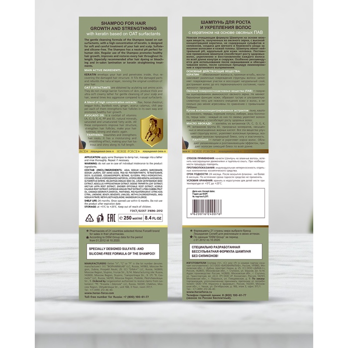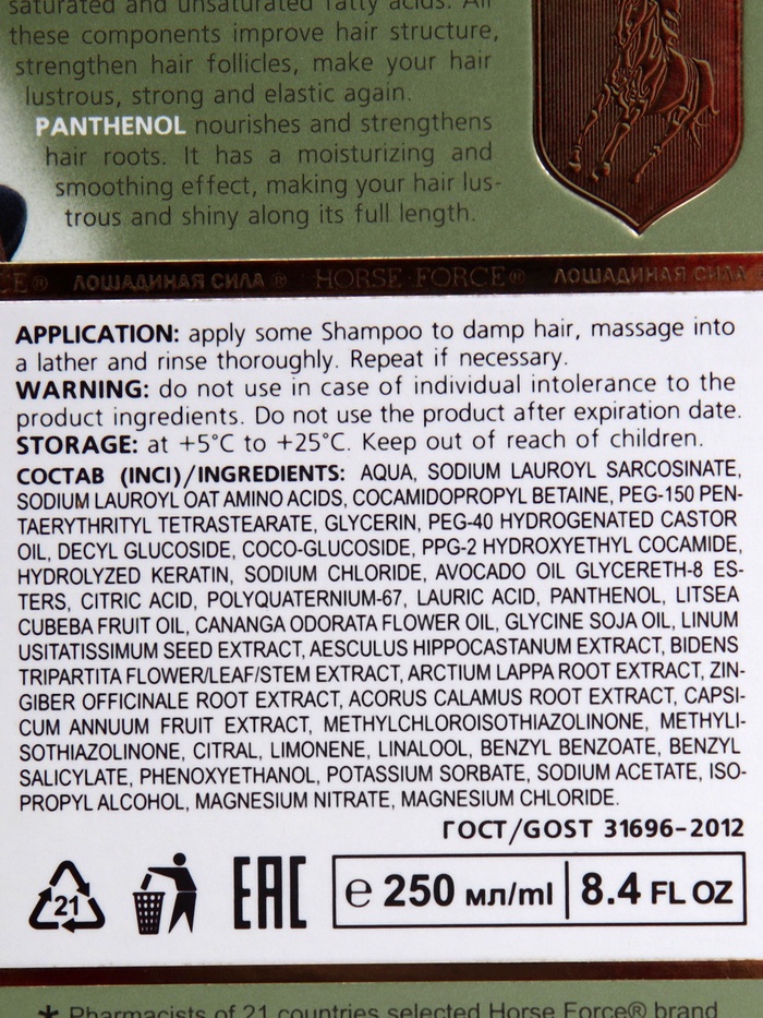 Шампунь Лошадиная сила для роста и укрепления волос с креатином на основе овсяных ПАВ, 250 мл